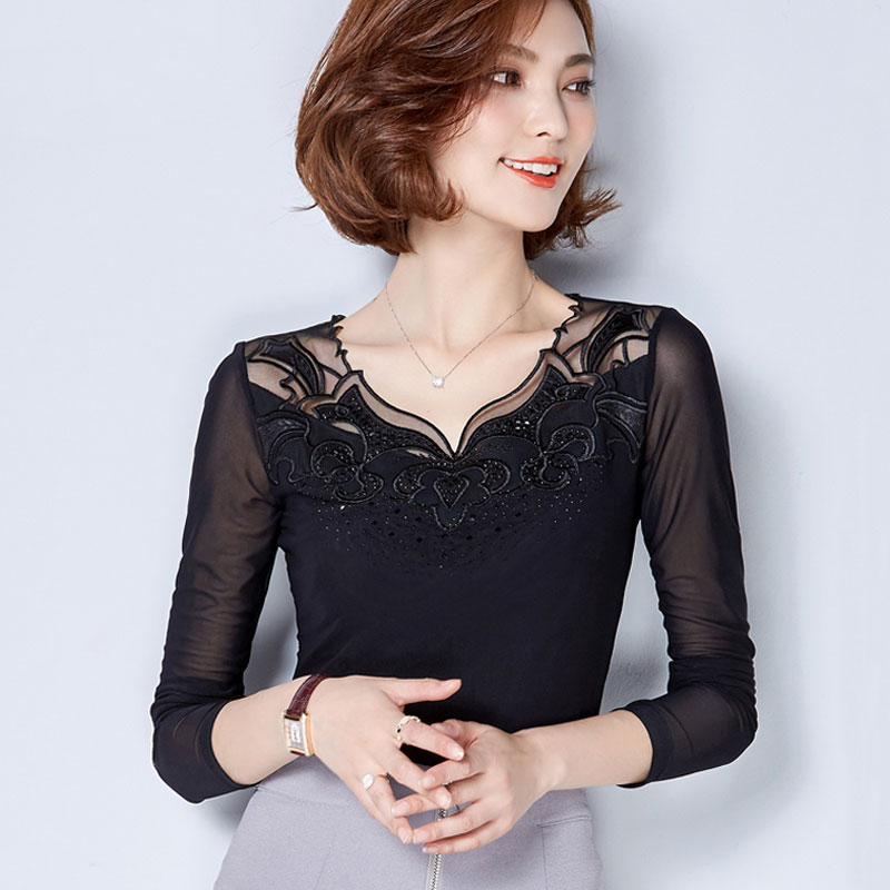 商品名称:韩美格2017春秋新款修身大码蕾丝网纱打底衫女长袖薄款圆领女T恤 全店商品 二件减5元 三件减10